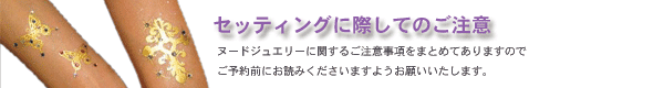 下記に該当する方にはお客様の安全を守るため、ヌードジュエリーのセッティングをお断りすることがございます。なにとぞご理解いただきましてご了承くださいますようお願いいたします。 ■アレルギー性皮膚炎やアトピーなどお肌が弱い方。 ■かぶれ、かさぶた、ひっかき傷がある方。 |